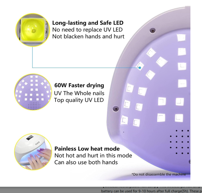 - This wireless gel nail lamp with built-in rechargeable battery can be used for 9-10 hours after full charge(3h). These portable nail lamps can be taken anywhere without the extension cord.