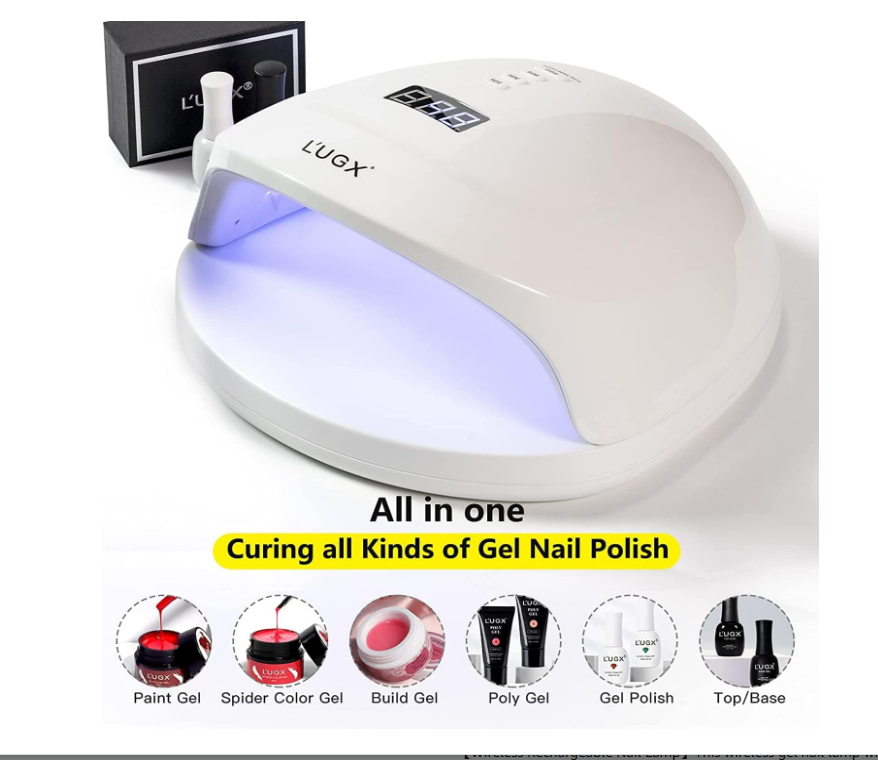 - L’UGX nail lamp comes with 36 dual light source lamp beads, the light shines from all directions and dries the nail polish quickly. And the light is soft (395-405mm) and not dazzling, which will not hurt your eyes and not black hands. This quick drying lamp can quickly dry all types of manicure and nail art.