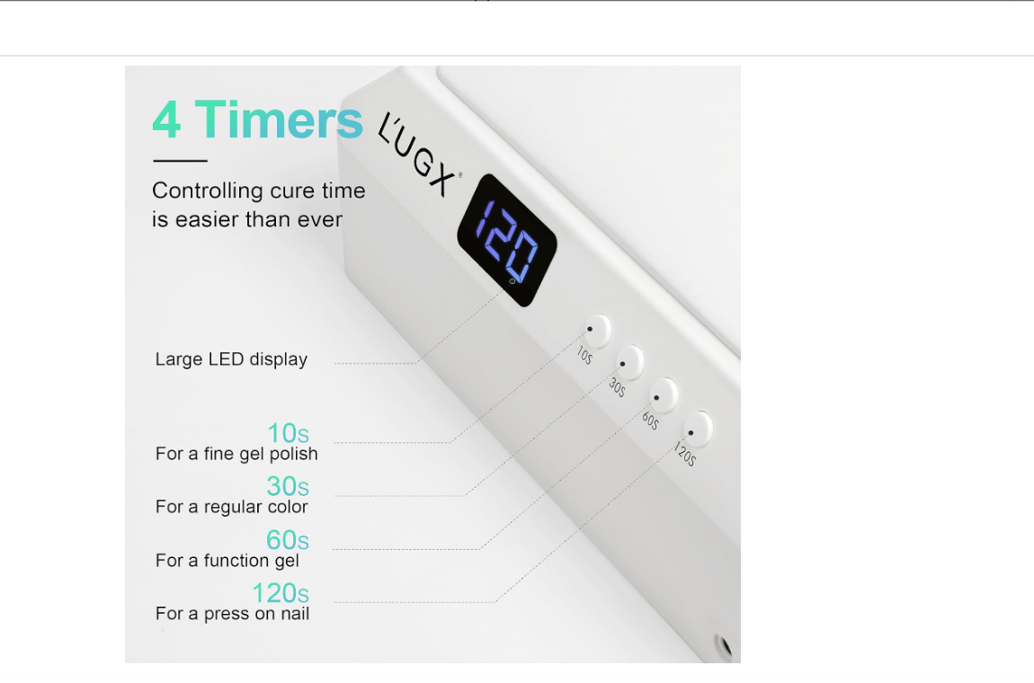 - Large LED display shows the usage time with 10s, 30s, 60s low heat mode, 120s double power mode 4 timer settings. Auto sensor, when you slide your hand/foot in, it comes on automatically for 120 seconds; or you can stop curing at any time by sliding the hand/foot out.